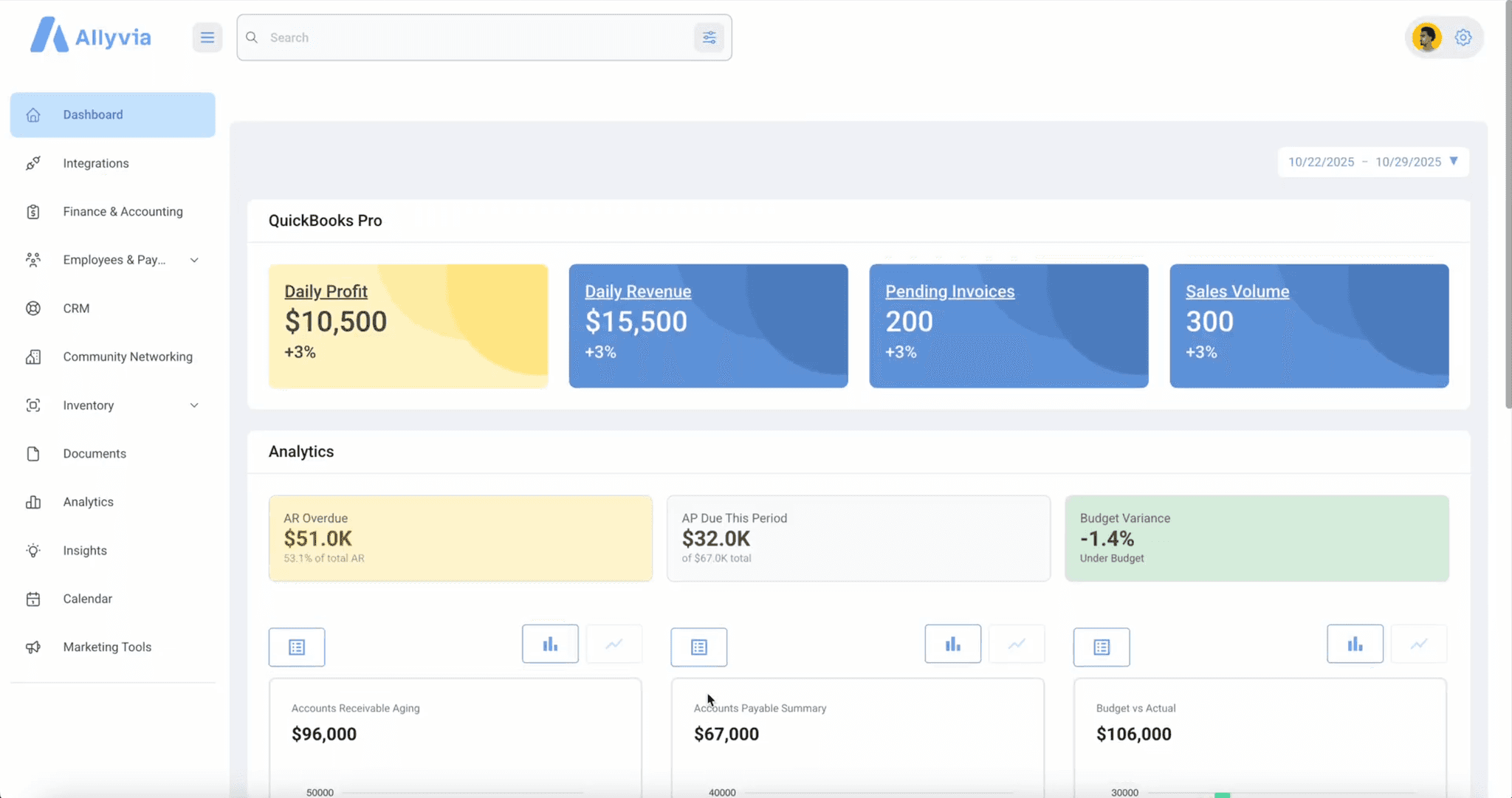 Allyvia combines finances, inventory, payroll and predictive insights from weather, trends local foot‑traffic into one unified platform and more. Get clarity, act faster, grow confidently.